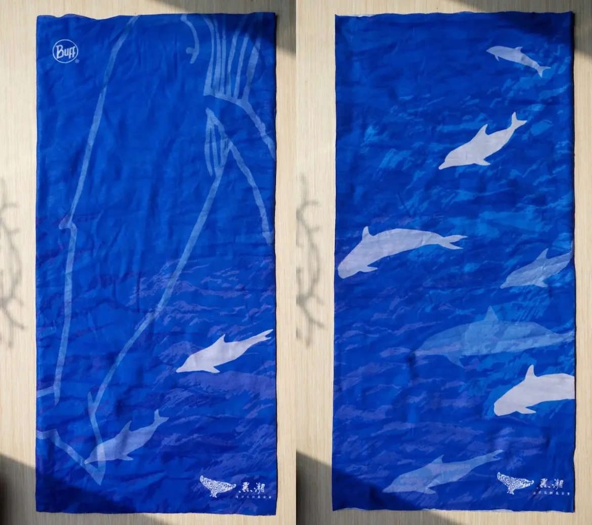 黑潮 海味頭巾|2015 黑潮海洋文教基金會【 海味頭巾 】設計 完成時間|2015.03合作單位|黑潮海洋文教基金會 ▍設計商品 黑潮海洋文教基金會【 海味頭巾】 ▍設計概念 海是安靜、變幻、深邃的,而海中的鯨魚和海豚是海的禮物。它們似乎不停地以波紋和身體靜靜說話。 本設計以手繪及剪紙複合創作,手繪海浪波紋,搭配鯨豚的剪紙,表現海裡不同層次所存在的安靜話語流動。選擇的鯨豚皆為台灣近海常見種類,包括飛旋海豚、瓶鼻海豚、花紋海豚、熱帶斑海豚、弗氏海豚,及大翅鯨等。 ▍相關設計商品 黑潮 海味潮 T|2014