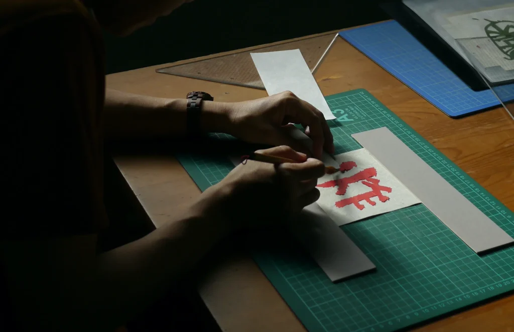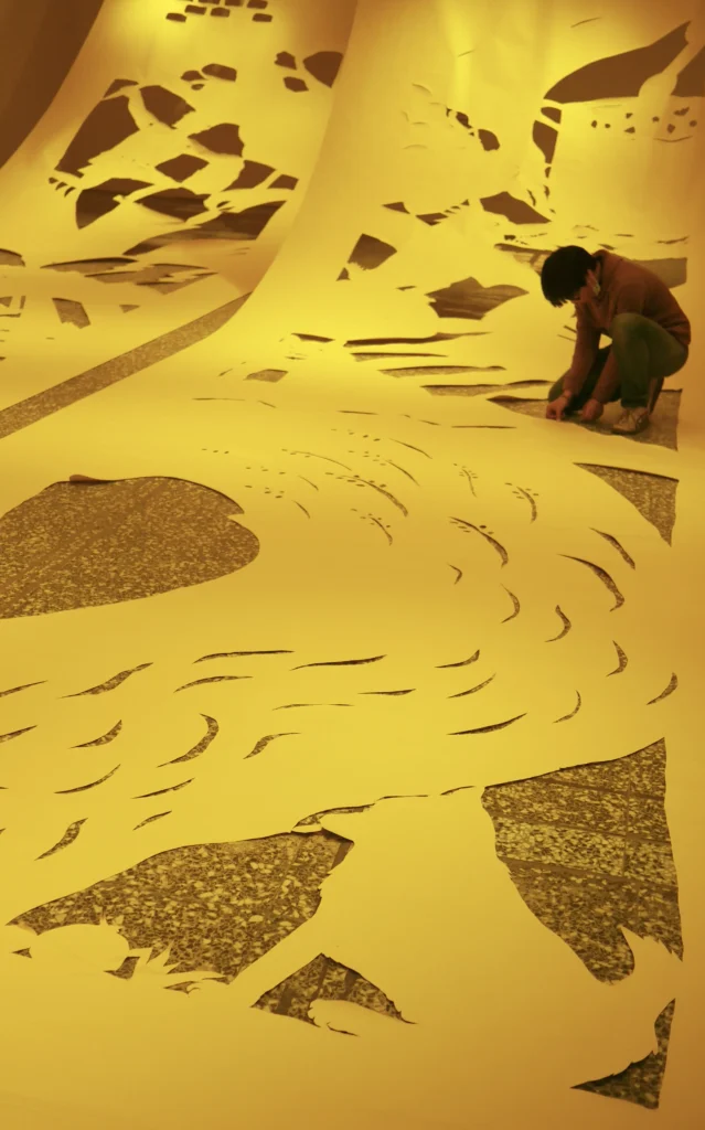 從小學美勞課會使用的色紙開始,逐漸嘗試不同紙材與尺寸。第一次做到全開作品時,赫然發現身體與作品有絕對的物理性關係:沒爬上桌子看不見整幅全貌、作品太大又只能放在地面剪,因此不斷爬上蹲下,動能位能轉換,「功」(work)不只做在紙上變成圖像,也做在酸疼的小腿肚上。原來創作也是身體的勞動。